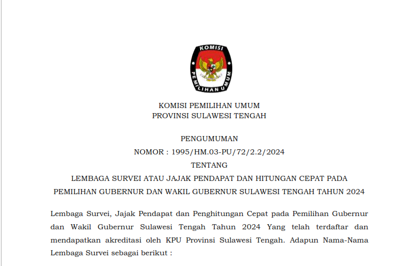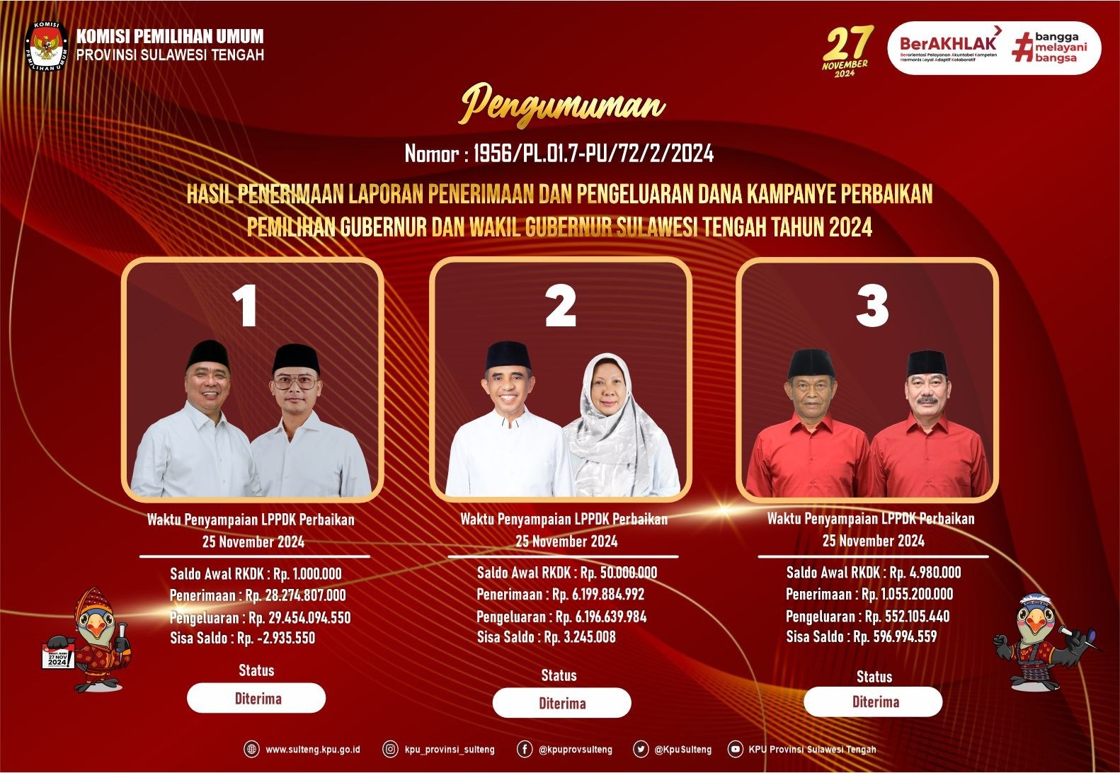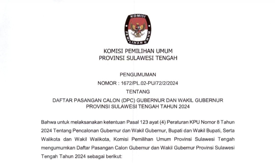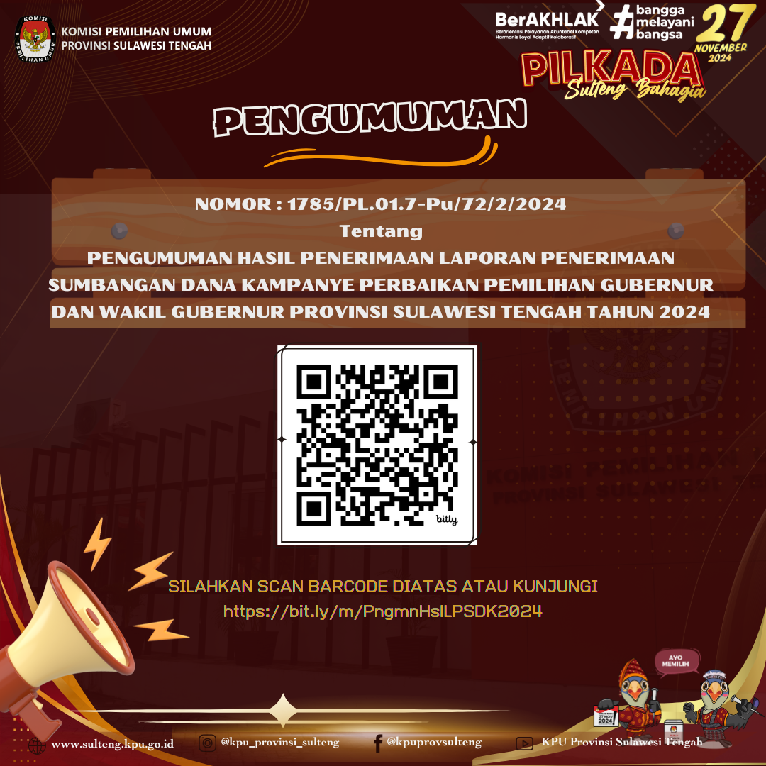 PENGUMUMAN KOMISI PEMILIHAN UMUM PROVINSI SULAWESI TENGAH NOMOR 1785/pl.01.7-Pu/72/2/2024 TENTANG HASIL PENERIMAAN LAPORAN PENERIMAAN SUMBANGAN DANA KAMPANYE PERBAIKAN PEMILIHAN GUBERNUR DAN WAKIL GUBERNUR PROVINSI SULAWESI TENGAH TAHUN 2024