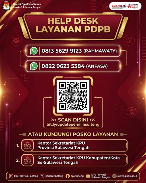 Sudah tahu belum? Pemutakhiran Data Pemilih Berkelanjutan (PDPB) Tahun 2026 telah dimulai! KPU Provinsi Sulawesi Tengah dan KPU Kabupaten/Kota se Sulawesi Tengah kini membuka HelpDesk layanan PDPB.