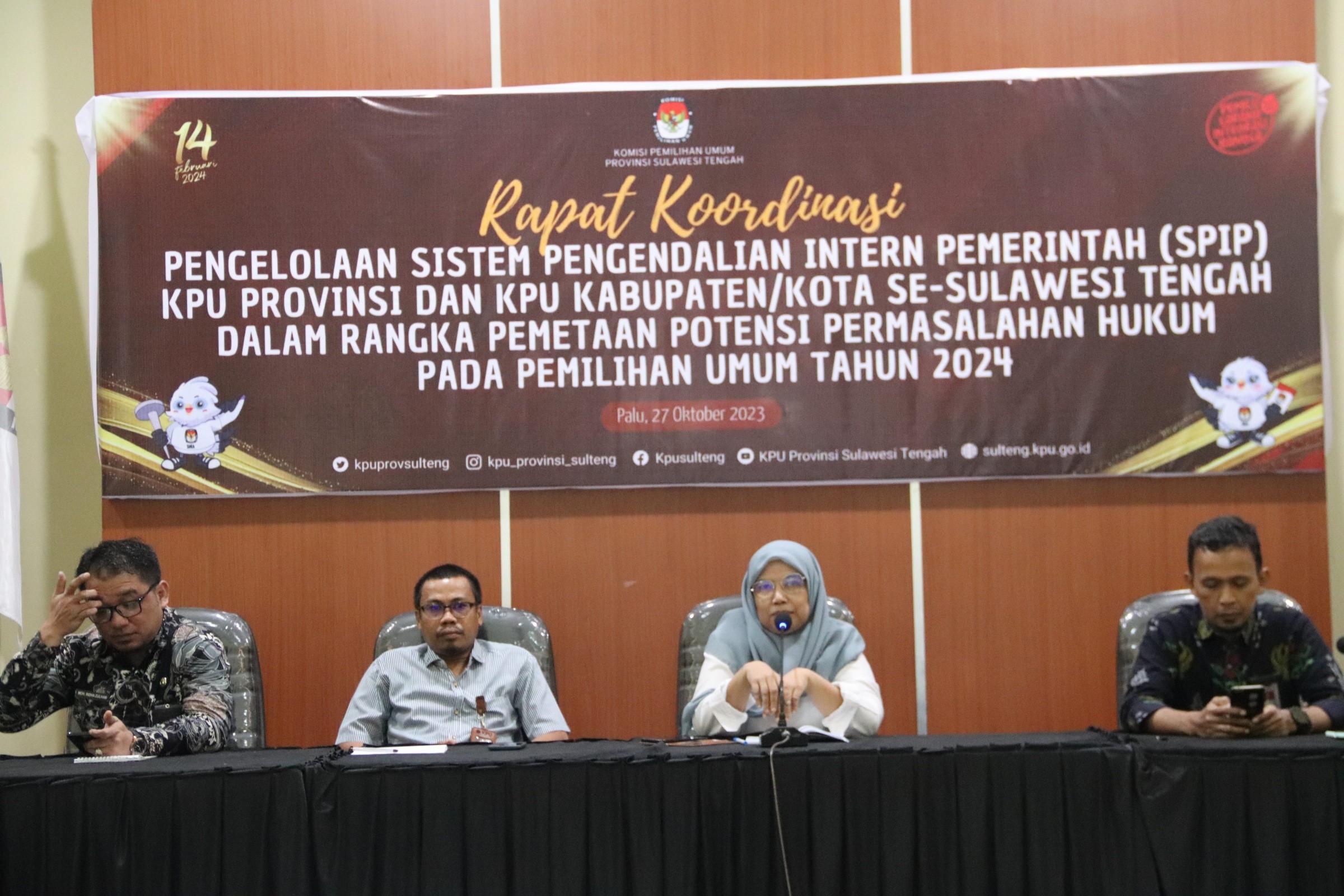 Palu, Sulteng.kpu.go.id, KPU Sulteng gelar Rakor guna Pemetaan Potensi Permasalahan Hukum melalui SPIP (Sistem Pengendalian Intern Pemerintah). Bertempat di Aula KPU Provinsi Sulawesi Tengah, KPU Sulteng Rapat Koordinasi Pengelolaan Sistem Pemgendalian Intern Pemerintah (SPIP) KPU Provinsi dan KPU Kabupaten/Kota dalam rangka pemetaan potensi permasalahan hukum pada Pemilu 2024, Jumat, 27 Oktober 2023. Darmiati Selaku Plh Ketua KPU Sulteng dalam sambutannya menyampaikan bahwa sebagai jajaran KPU harus jeli melihat pitensi permasalahan hukum yang akan dihadapi. Didepan mata kita mempersiapkan dokumen untuk penetapan daftar calon tetap, jika melihat tentu akan berimplikasi terhadap laporan kode etik, pidana dan pelanggaran administrasi, olehnya diharapkan dalam melaksanakan tugas dan kewajiban memperhatikan ketentuan ketentuan, kita berharap memperhatikan hal hal yang sudah menjadi petunjuk teknis dan berkoordinasi dengan KPU Prov Sulteng. “Juga harus mempersiakan pembentukan KPPS, memperhatikan permasalahan hukum yang dihadapi karena desa dan kelurahan sdh dibentuk tim sukses parpol. Perlu kejelian untuk memperhatikan netralitas dan indepoendsi setiap calon penyelenggara. Juga harus buat kegiatan penguatan kapasitas SDM, karena merekalah yang melaksanakan tugas inti, makanya kita harus menjelaskan terkait pemungutan dan penghitungan suara. Potensi lain adalah penetapan DPTB, ada pemahaman yang berbeda anatara KPU dan Bawaslu, kita menjadikan DPTb sudah final, padahal sesungguhnya datanya belum boleh keluar karena belum final, ujar darmi”. Mohammad Taufiq selaku Sekretaris KPU Provinsi Sulawesi Tengah juga menyampaikan arahan umum dalam kegiatan dimaksud, kita telah masuk dalam tahapan logistik dan mari kita mengawal dan mengsukseskan semua tahapan Pemilu yang nantinya akan padat dan beririsan dengan Tahapan Pemilu, ujarnya”. Dalam Kegiatan tersebut juga mengundang Narasumber dari Instansi lain yakni BPKP Provinsi Sulawesi Tengah dengan membawa materi Akuntabilitas Keuangan Negara, Penilaian Risiko, Informasi dan Komunikasi, serta Pemantauan Pengendalian Intern bagi KPU Provinsi dan KPU Kabupaten/Kota, Ketua Bawaslu Provinsi Sulawesi Tengah dengan materi Pemetaan Potensi Pelanggaran Pemilu Dalam Rangka Manajemen Risiko Pelaksanaan Tahapan Pemilihan Umum Tahun 2024 serta dari Kejaksaan Ting Provinsi Sulawesi Tengah dengan materi Peran Kejaksaan dalam Pengawasan dan Penaganan Tindak Pidana Pemilihan Umum. (humas kpu sulteng Nirwana/foto: Wahyu/ed diCherly)