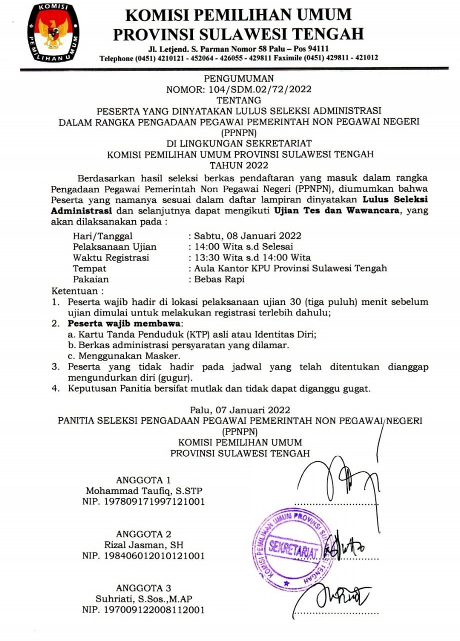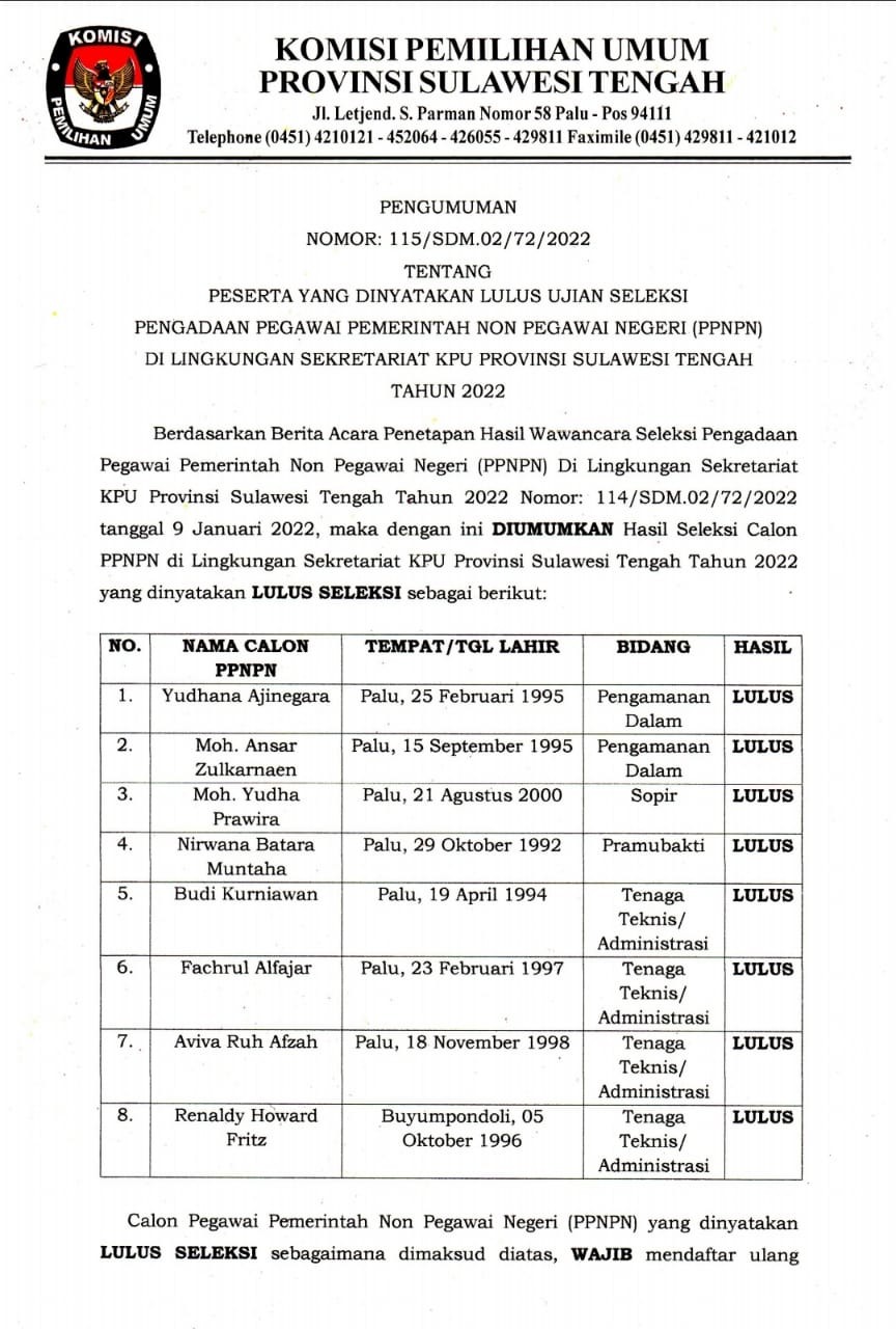 Palu, sulteng.kpu.go.id - Pengumuman No. 104/SDM.02/72/2022 tentang Peserta Yang Dinyatakan Lulus Seleksi Administrasi Dalam Rangka Pengadaan Pegawai Pemerintah Non Pegawai Negeri (PPNPN) Di Lingkungan Sekretariat KPU Provinsi Sulawesi Tengah Tahun 2022 pada tanggal 7 Januari 2022.
