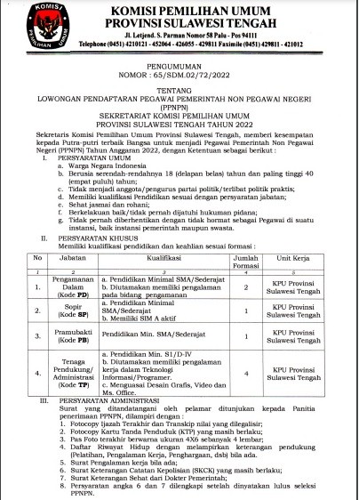 KPU Provinsi Sulawesi Tengah mengeluarkan Pengumuman No. 65/sdm.02/72/2022 tentang Lowongan Pendaftaran Pegawai Pemerintah Non Pegawai Negeri (PPNPN) Sekretariat KPU Provinsi Sulawesi Tengah Tahun 2022 pada tanggal 5 Januari 2022. Selengkapnya...... [ Klik Disini ]